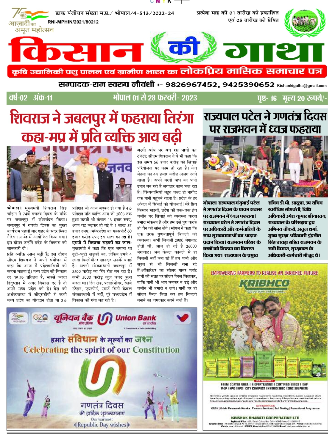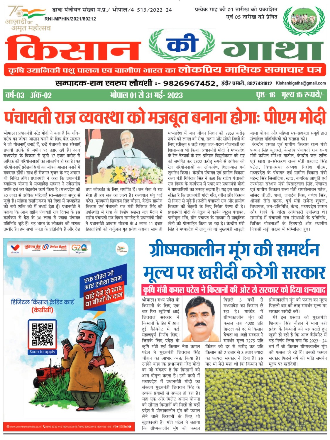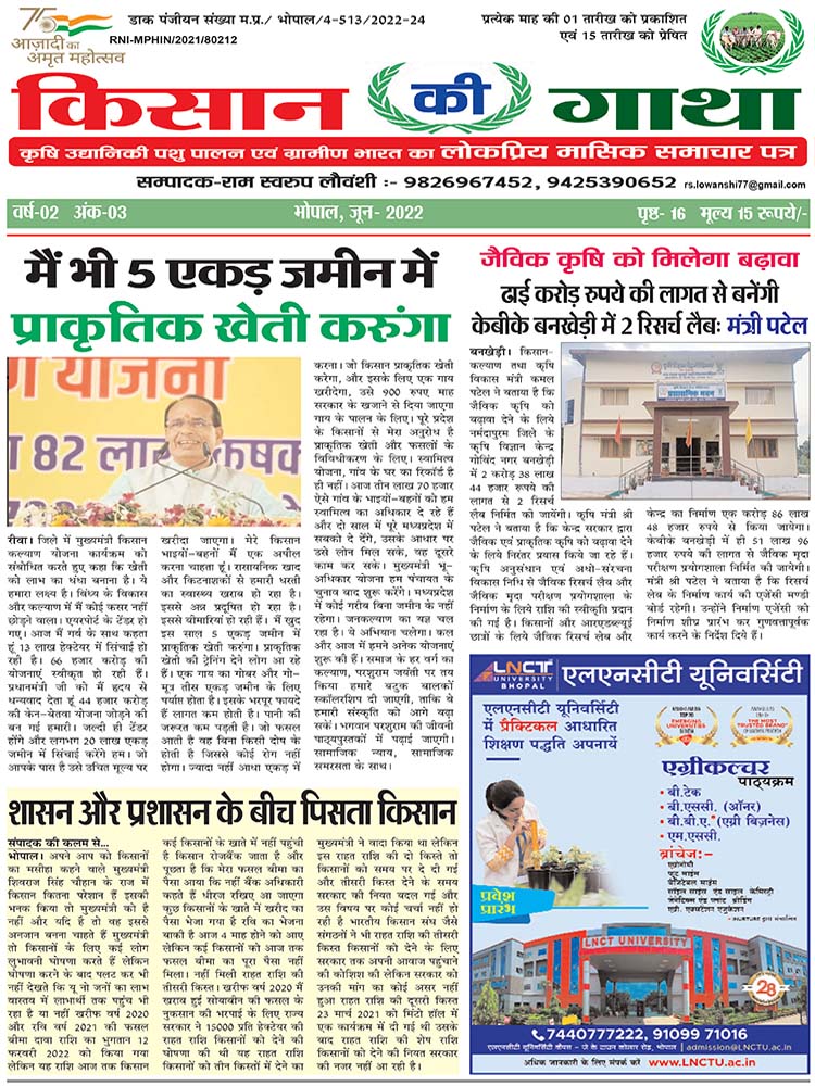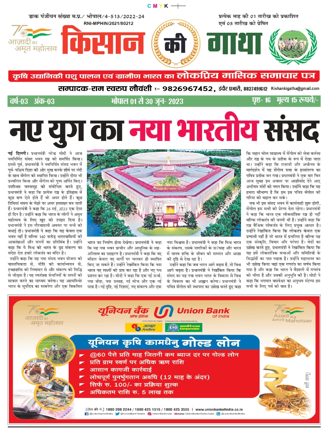 Kisan Ki Gatha is a popular monthly newspaper of Agriculture, Horticulture, Animal Husbandry, and Rural India. It is published on the 1st of every month and observed on the 15th.