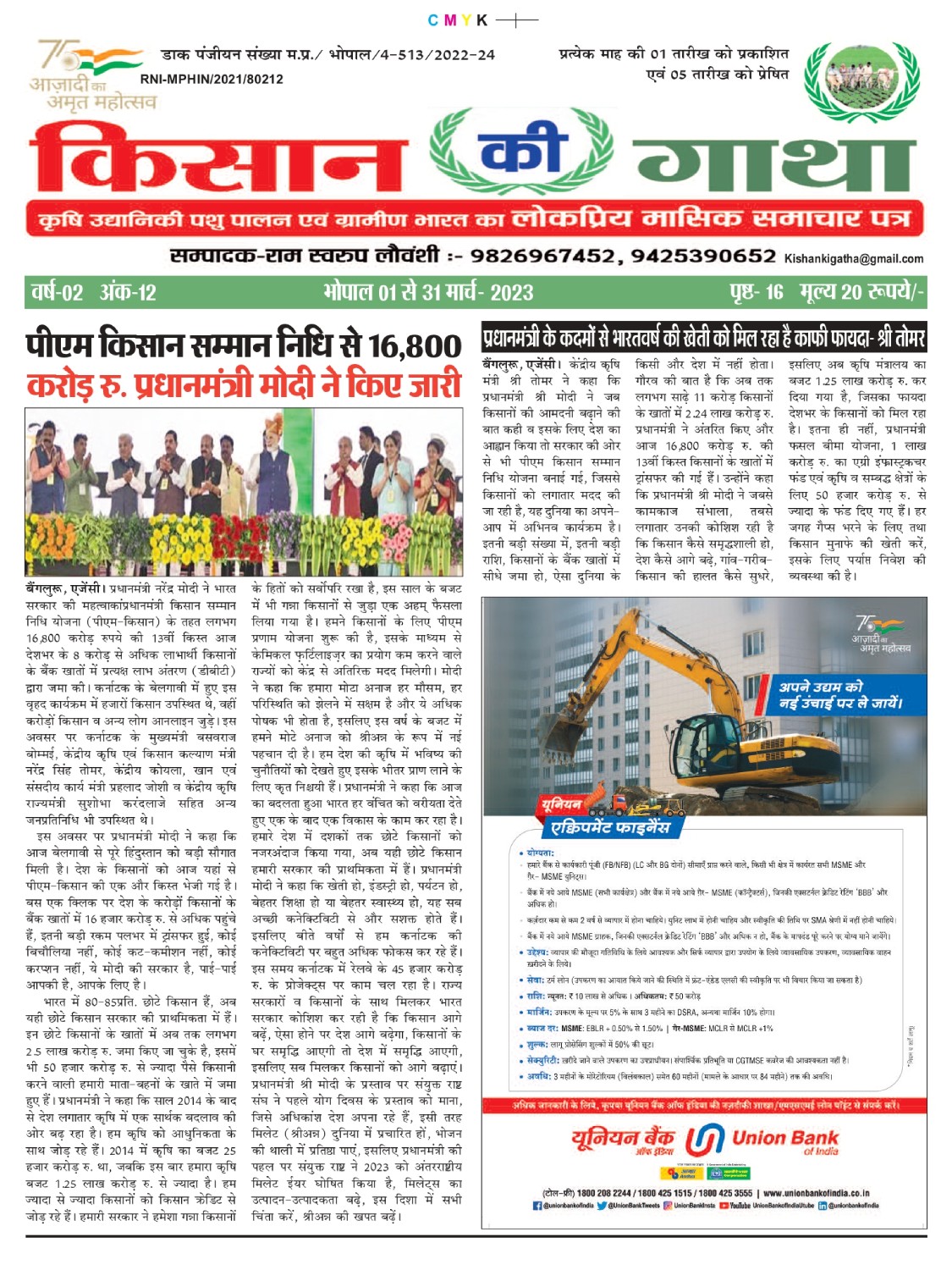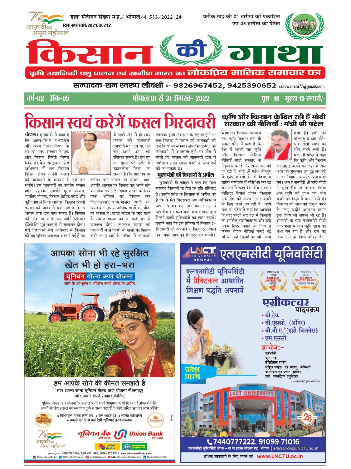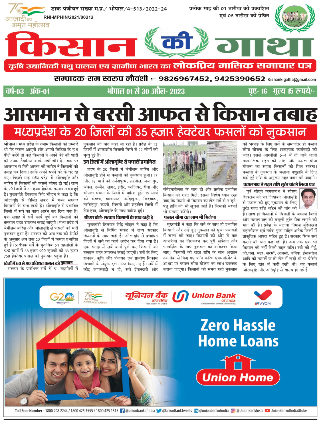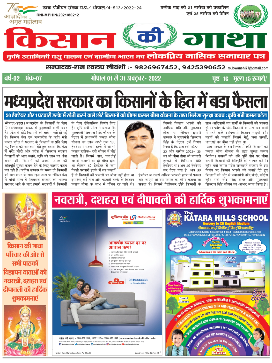 Kisan Ki Gatha is a popular monthly newspaper of Agriculture, Horticulture, Animal Husbandry, and Rural India. It is published on the 1st of every month and observed on the 15th.
